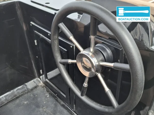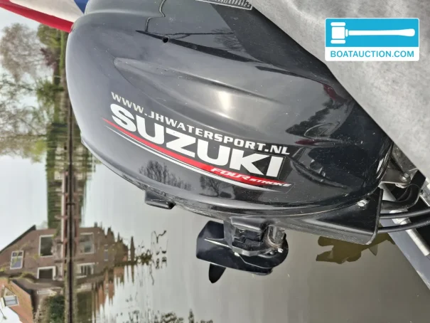 On the transom is a 2019 Suzuki 15 hp outboard with electric start. The engine is operational and, according to the owner, has around 100 running hours, which fits recreational summer use. This combination is attractive for anyone looking for a sloop with an outboard that is easy to operate and responds quickly to the throttle. The petrol tank has a capacity of 10 litres and there is one 12V battery for the electrical systems and starting. Thanks to the outside wheel steering, you maintain a natural seating position and good all-round visibility while underway, which is especially pleasant in busy canals or when docking.