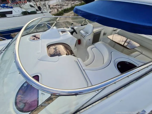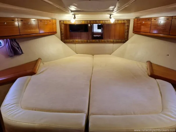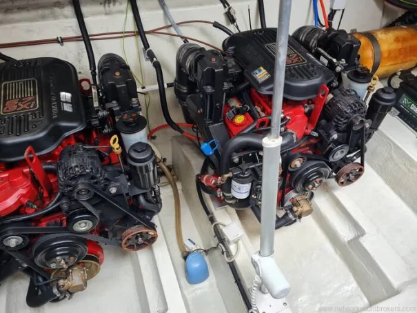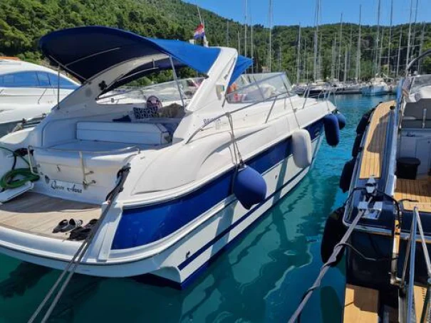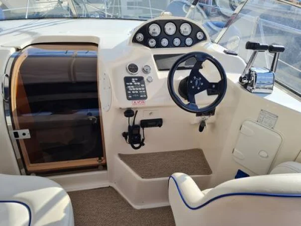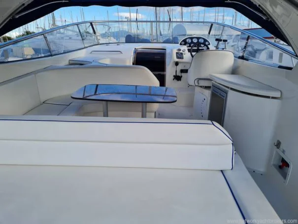 The two-cabin layout works well for a couple with guests, and the cream leather interior gives the motor boat a clean, well-maintained feel. The cockpit is practical and well-suited to day use and coastal passages, with a hot and cold shower, cockpit table, and ample locker space. With planing speeds available from the twin 320hp Volvo Penta engines, she is capable of covering ground quickly when conditions permit.