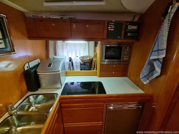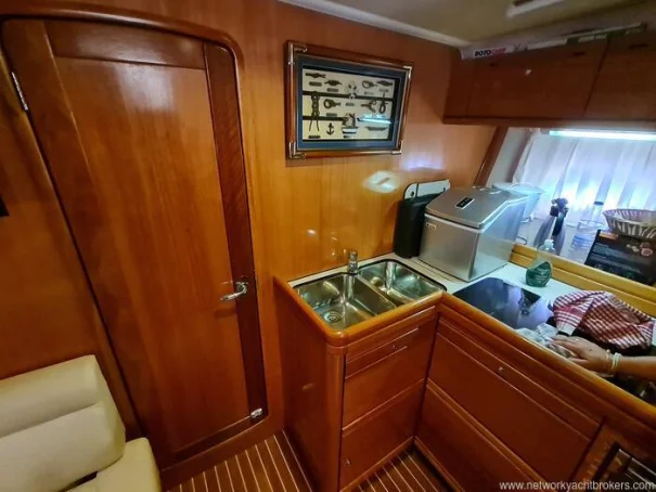 The galley is equipped with a two-burner electric hob, a paraffin burner, a gas grill with fitted barbecue platform, a twin stainless steel sink, an Isotherm compressor refrigerator with freezer compartment, and a separate cool box. Pressurised hot and cold water is supplied throughout, with hot water via engine calorifier and shore power immersion heater. A microwave is fitted. The heads compartment is equipped with an electric flush toilet and shower. Air conditioning is provided by a stand-alone portable unit. Entertainment includes a Blaupunkt CD stereo, two new flat-screen televisions, and a TV aerial.