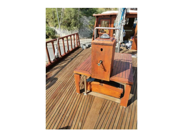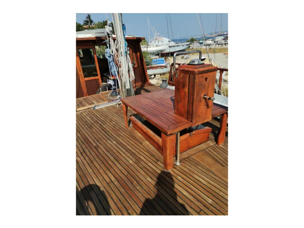 Six cabins below decks — a double, a skipper's cabin and four guest cabins with bunk configurations, one sleeping four — give MILEO genuine versatility across liveaboard, private charter and crewed passage work. Two heads serve guests, with separate crew quarters kept properly separate. The galley is equipped with oven, refrigerator and hot water, while heating throughout makes year-round cruising a realistic proposition. Teak cockpit and teak side decks set the tone on deck — properly finished, properly traditional.