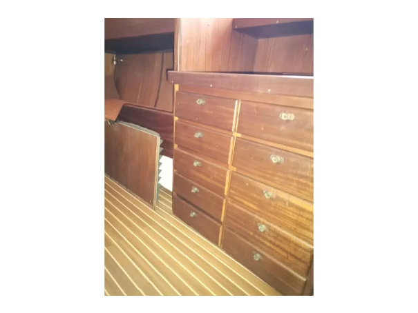 The ketch rig divides the canvas intelligently — a fully battened mainsail, furling genoa and a cruising gennaker for reaching miles, with a storm jib standing ready when the weather turns honest. Lazyjacks, lazy bag and genoa cover mean sail handling is manageable short-handed. This is a boat that rewards a capable crew but does not demand one.