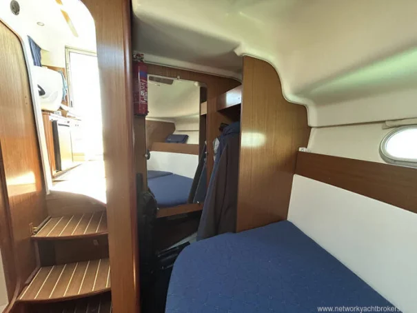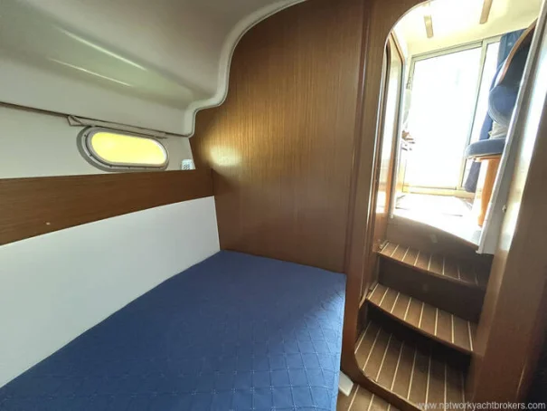 Forward, the separate master cabin features a generous double berth, good headroom, useful storage lockers, and opening ports providing natural light and ventilation, creating a comfortable and private sleeping space.