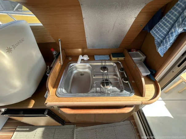 The galley is practical and well equipped for weekends aboard, featuring a two-burner gas hob, sink with pressurised hot and cold water, fridge, and ample storage for provisions and cookware.
