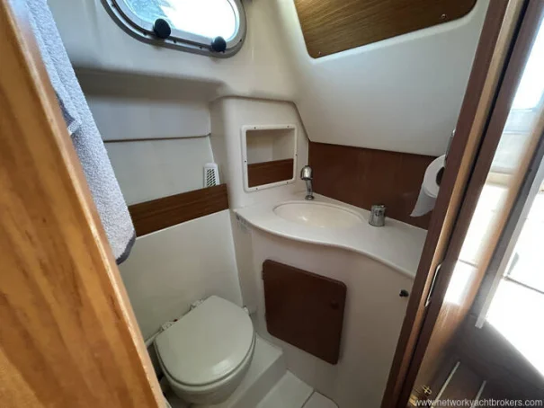 The separate enclosed heads compartment includes a marine toilet, wash basin, and shower facility with hot and cold water, providing excellent onboard convenience and privacy.