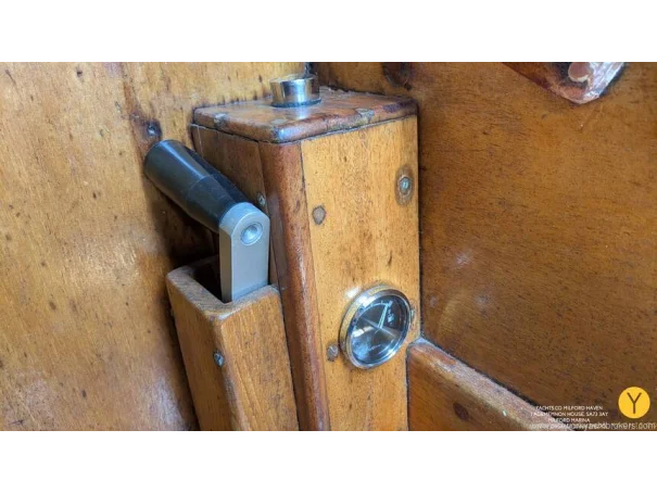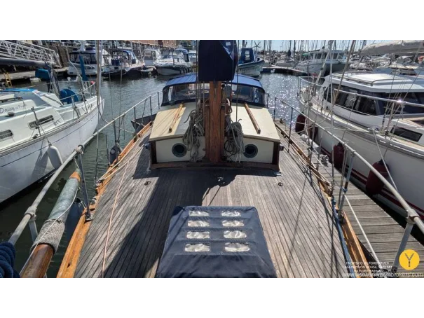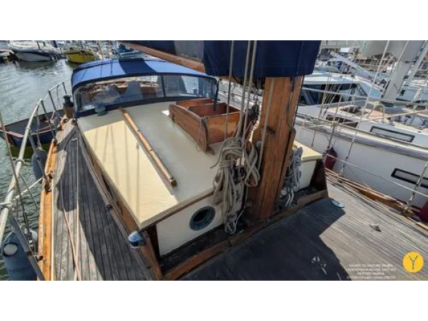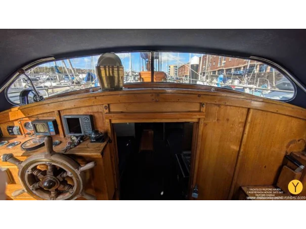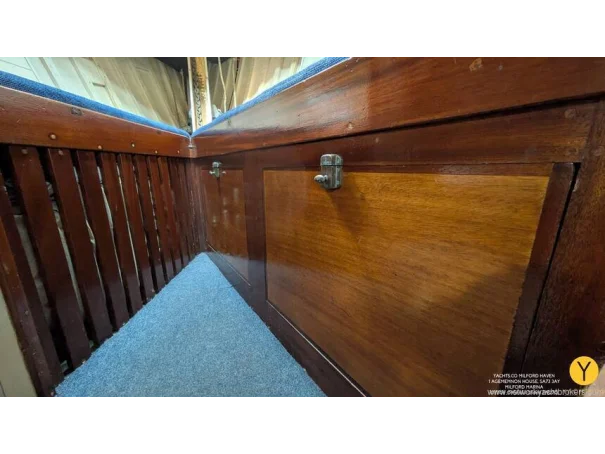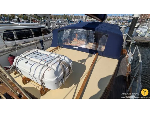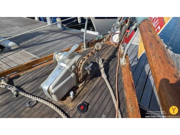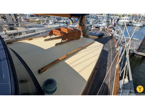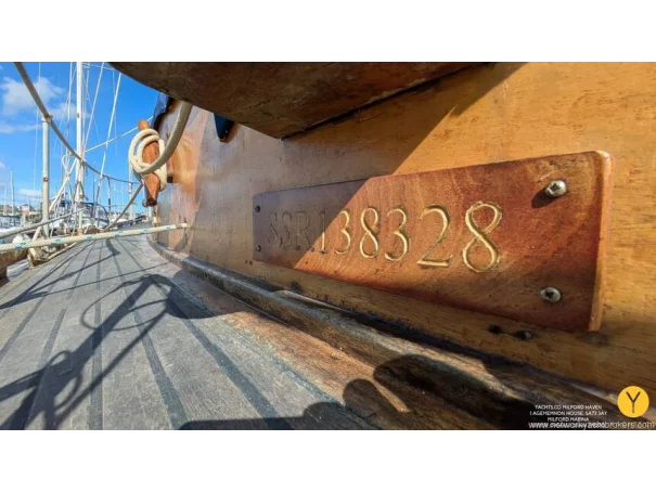 Re-fit 2002-2009: Port and Starboard topsides virtually re planked in 1" Iroko. A number of ribs and beams replaced in oak. Stern and quarter coamings replaced. New decks fitted, and encapsulated in fibreglass. Teak with mahogany covering boards laid overall. New rubbing streak in 3" oval Iroko. Toe rails replaced with riased mahogany rails. All keel bolts withdrawn and tested, 2 replaced. Fore deadwood and sternpost bolts drawn and replaced with galvanised.