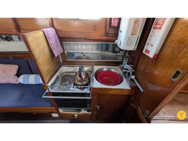 Galley, with sink, oven, hot wat heater and storage.