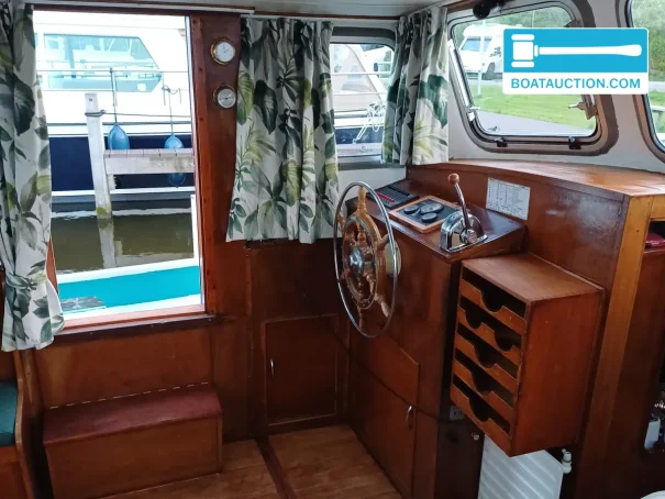 she combines the familiar cutter feel with practical liveability. inside, headroom is about 1.85 metres, making time on board comfortable, even for longer stays. the wheelhouse has a roof hatch and spacious settees, creating a pleasant place to sit together both underway and at anchor. especially attractive is the dual steering with wheel, so in fine weather you can also steer from the upper position on deck and fully enjoy the view. for those searching terms such as waalkotter for sale, steel motorboat, cutter yacht or motorboat with wheelhouse, this type of vessel is known for its space and calm handling on canals, lakes and waterways.