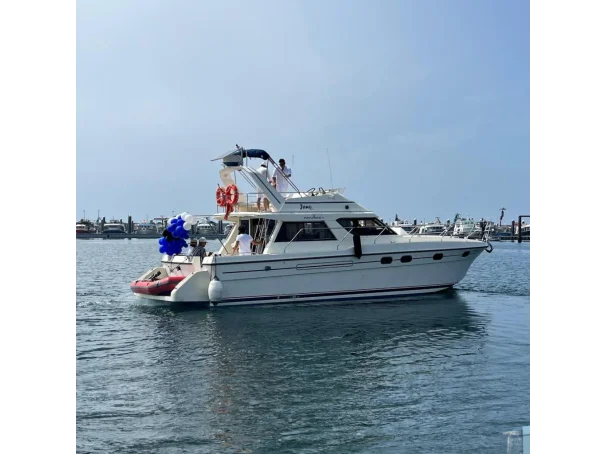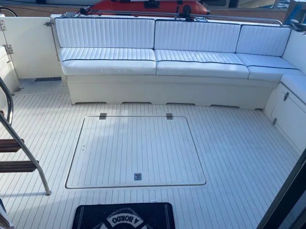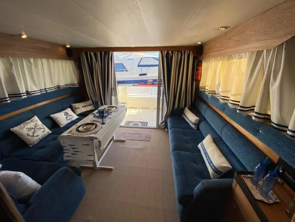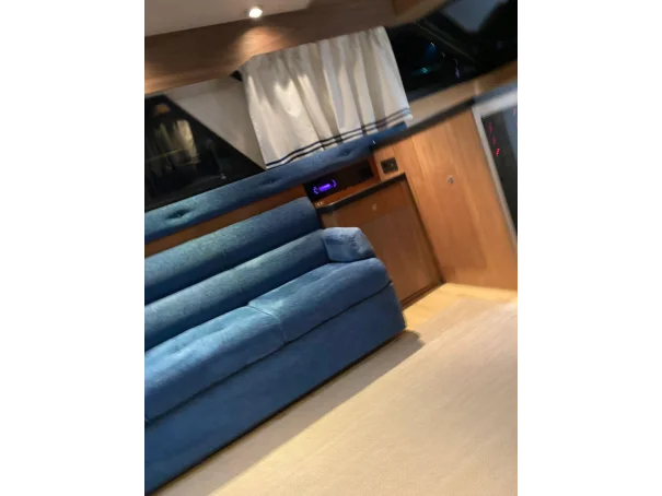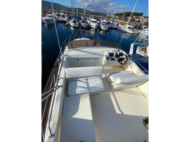 Number of passengers 12 two cabins It has a depth sounder, autopilot, radar, VHF, GPS The cruising speed is 17 knots and the maximum speed is 28 knots hydraulic flaps WC, according to regulations Hydraulic steering Room table sun canopy Anchor canvas electric windlass Camper hood Radio CD-TV Battery charger Bow thruster Three bilge pumps Take 220V. All sun in the bathtub Kitchen-microwave-electric refrigerator