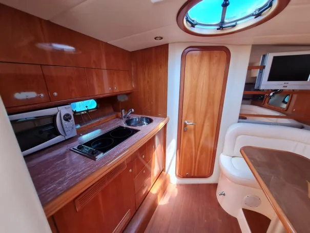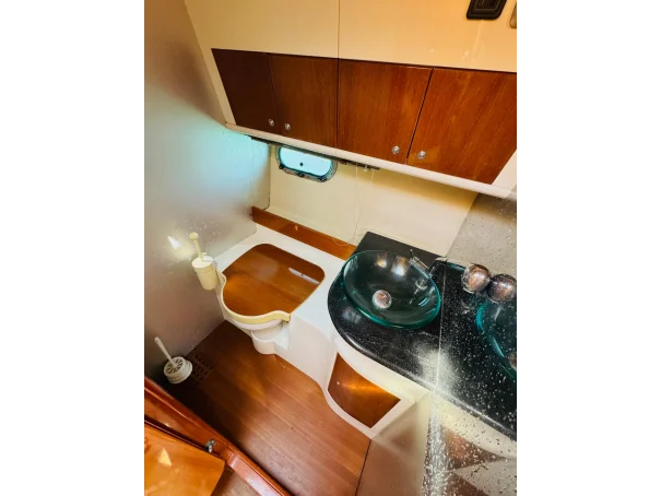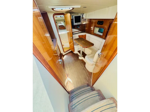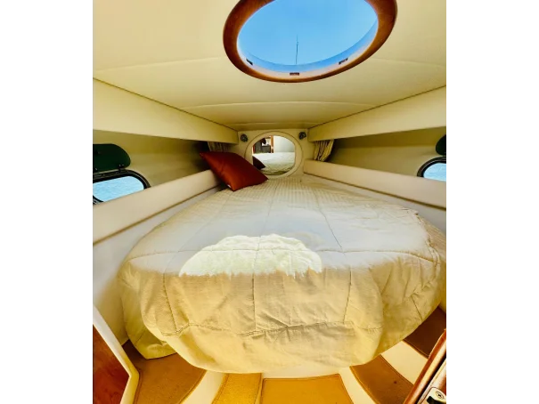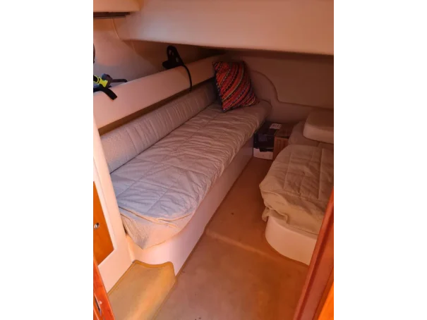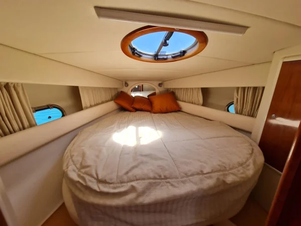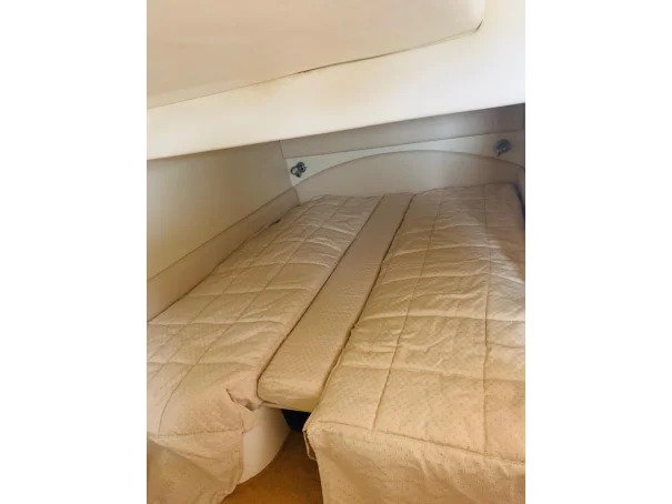 Este barco tiene la cabina principal en proa, con una cama de matrimonio y otra cabina dobre con dos camas individuales en la popa. Tiene un baño electrico.