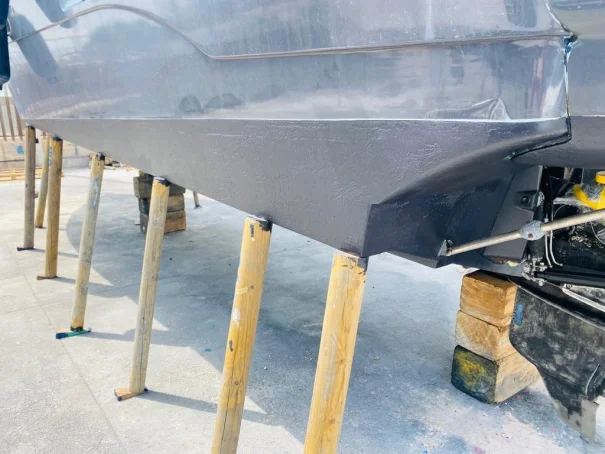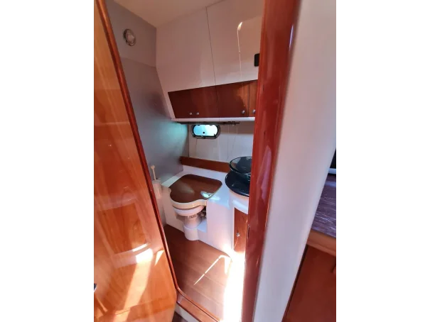 This boat features a main cabin located in the bow, equipped with a double bed, and a twin cabin with two single beds in the stern. It has an electric toilet.