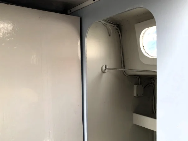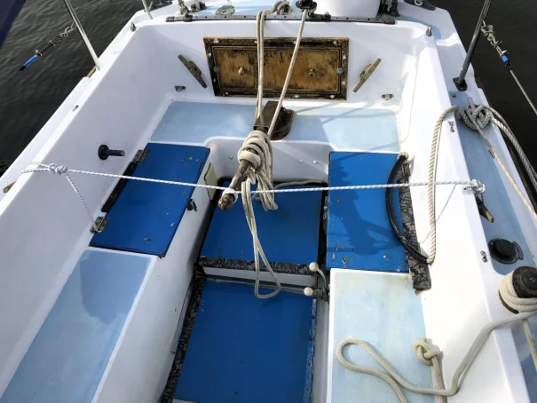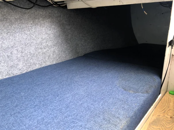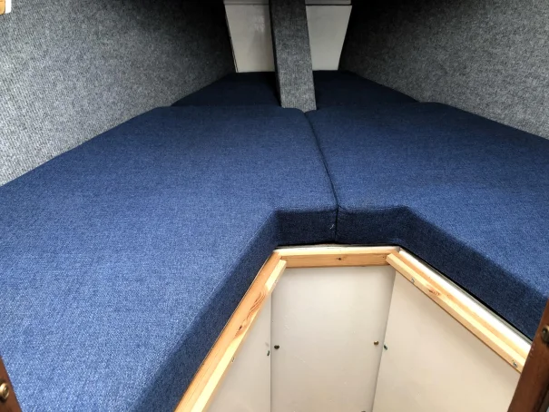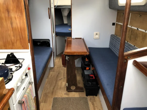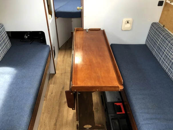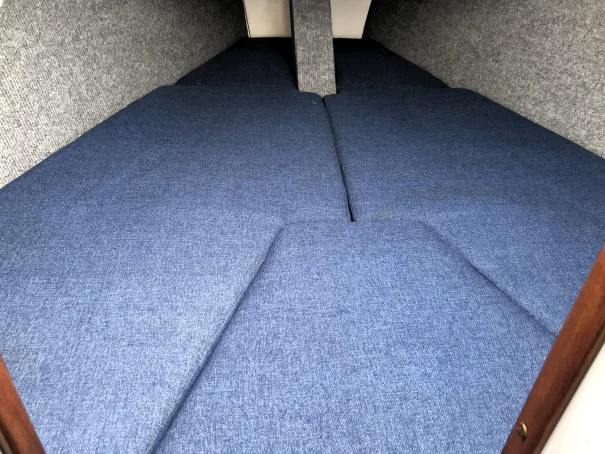 Sleeping 5 in 2 cabins. Light blue upholstery throughout in good condition.