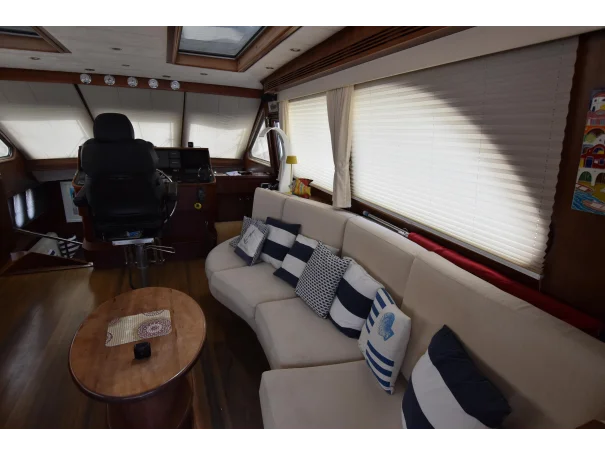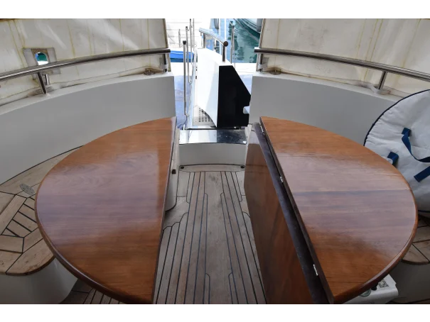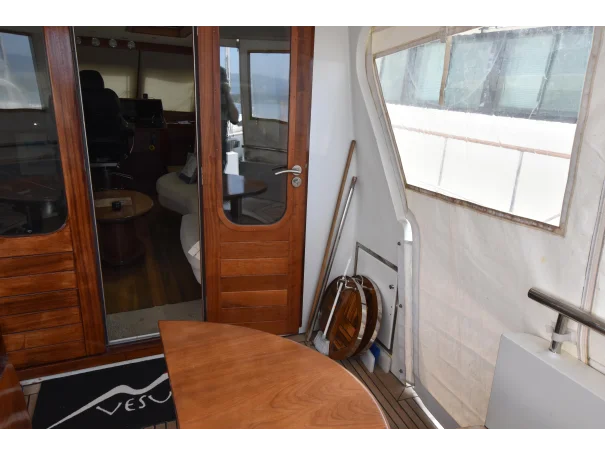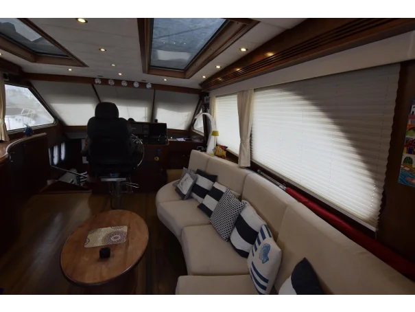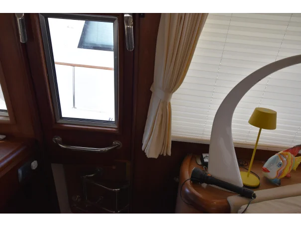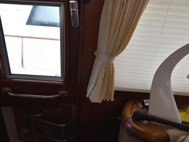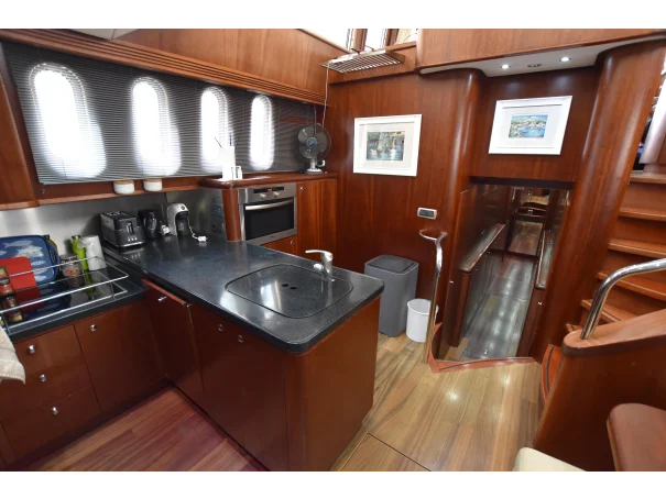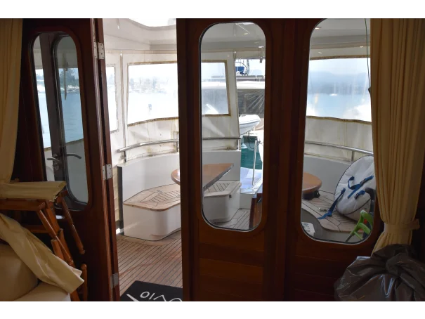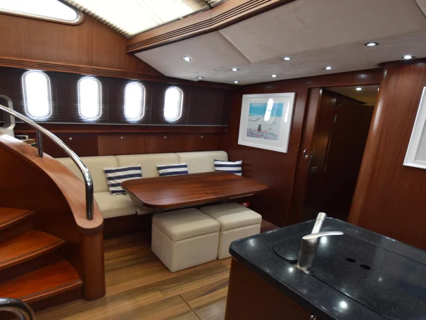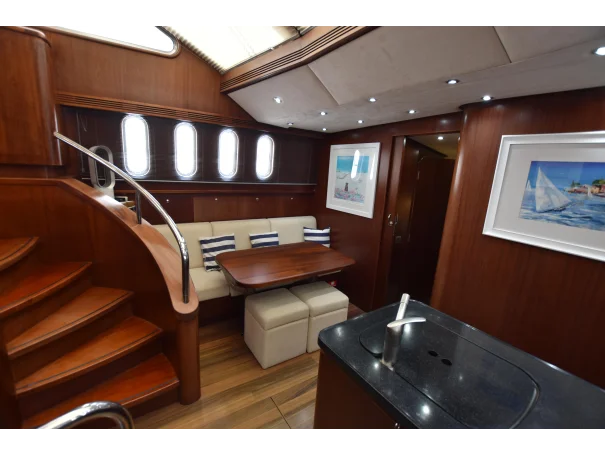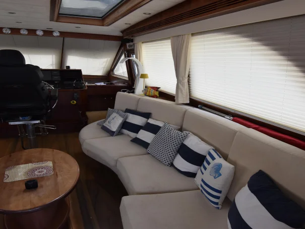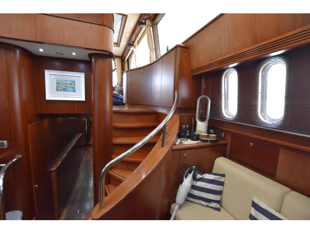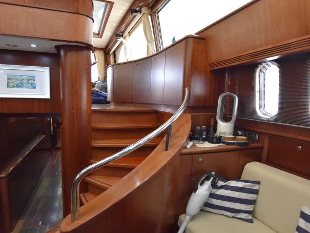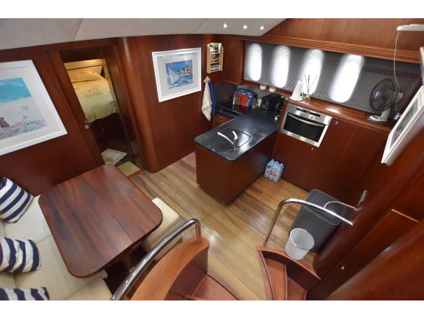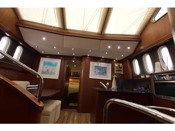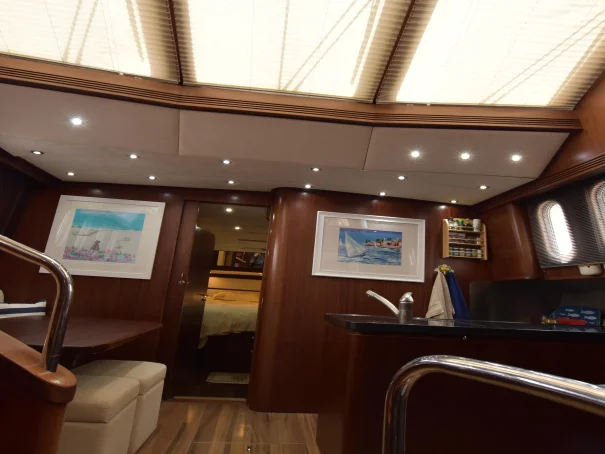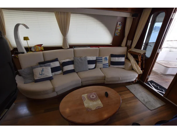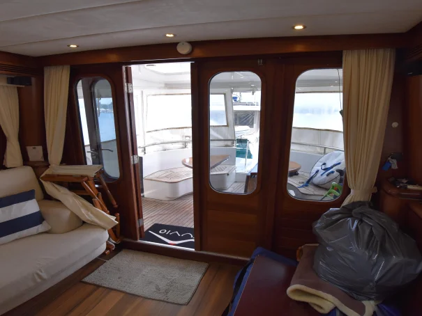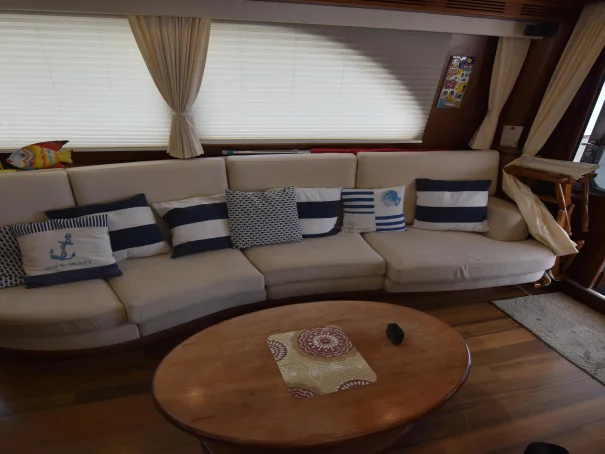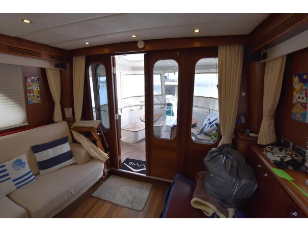 Opening directly from the cockpit into the living room. This includes a comfortable settee, mahogany furniture and a retractable led Samsung the frame 2022. Also in this area is a extra fridge. (2023).