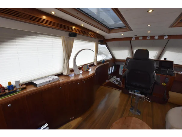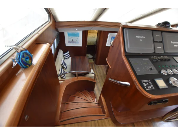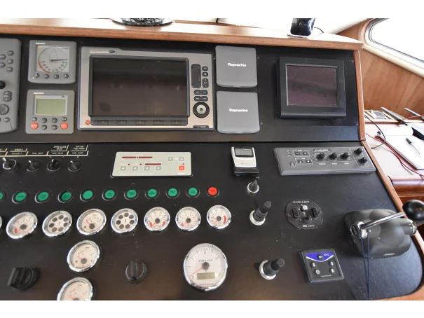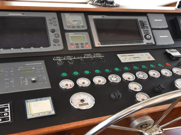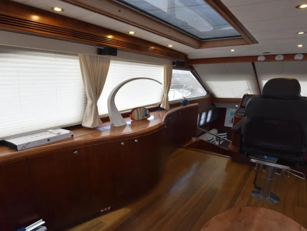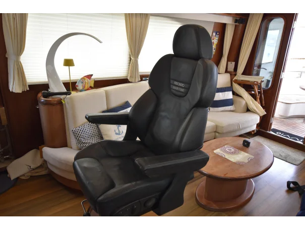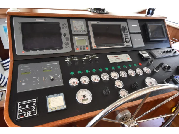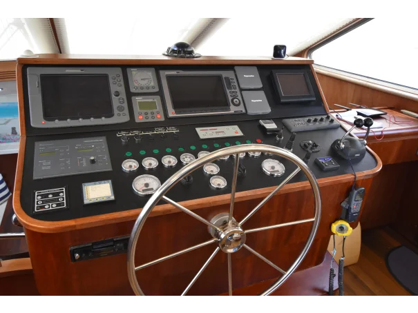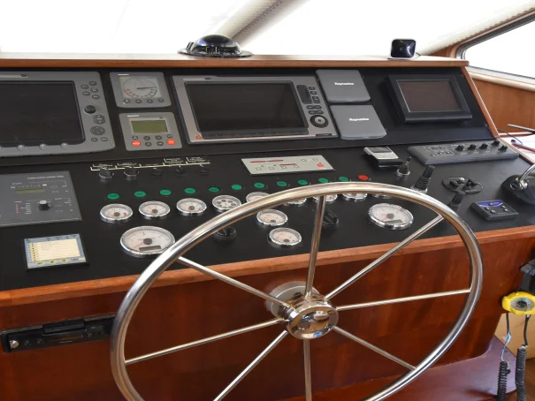 Towards the bow in the centre is the helmet station with full electronics, and a steel steering wheel.