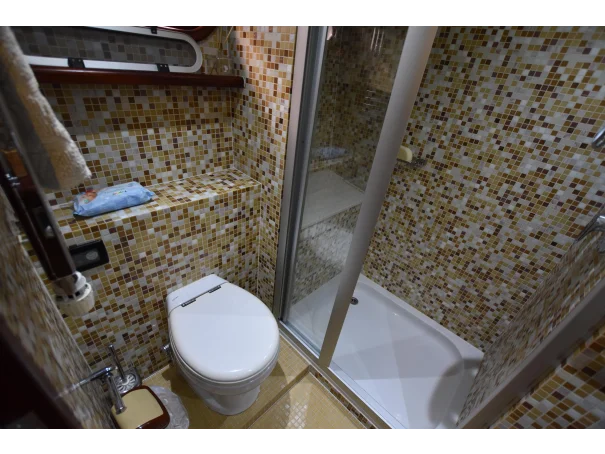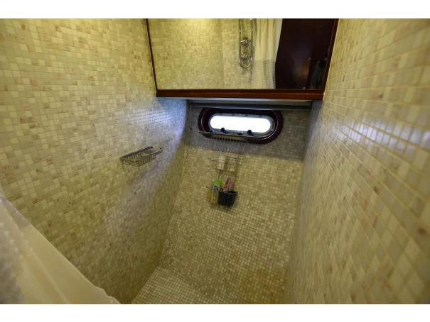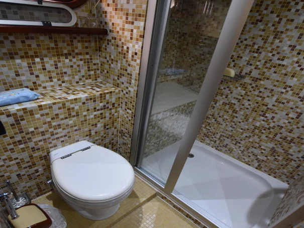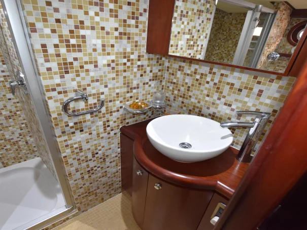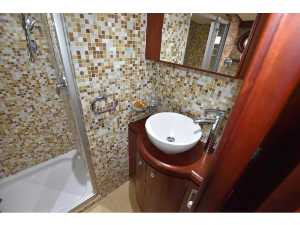 Large ensuite bathroom with basin, toilet, bidet to the one side. The other side has the large walk-in shower room, with 2 double twin cabins with en-suite bathrooms. Both bathrooms have a basin toilet and walk-in showers. Both cabins have portholes which open up onto the bathing platform.