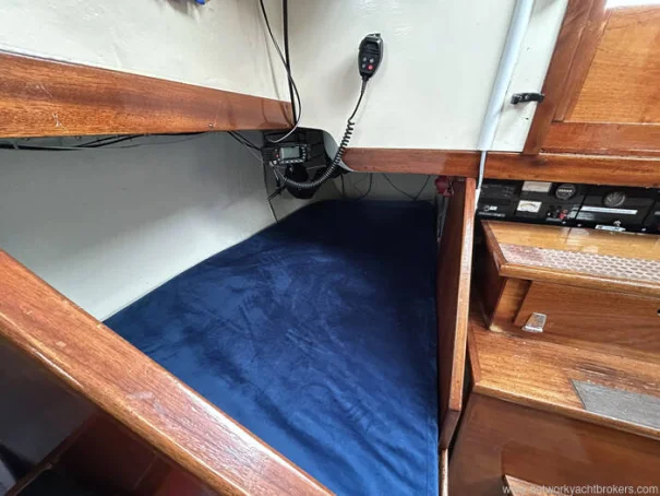 Adjacent to the galley on the starboard side is a double berth with under berth and shelf storage. Located above the quarter berth is the VHF, Raymarine Chart Plotter,