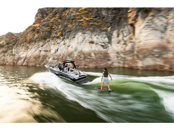 The NV233 takes it up a notch from the entry Centurion NV213, with two more feet of length, room for two more passengers and the exotic sports car look that says high performance even when docked. It comes with up to 5000 pounds of available ballast, more than half of which can be filled in 90 seconds with available RAMFILL2. This isn’t a stripped-down version of a more expensive Centurion or an older design dressed-up new, the Nv233 is designed from the water up to deliver precisely what you need to get the most out of your water sports experience. The Nv233 offers world championship caliber surf, with the ability to propel you to your own best performance. Unique to the Nv Series design is the unobstructed GatorStepped space between the tower and the dash that facilitates easy communication directly with a rider – perfect for coaching. An abundance of built-in quality features means the Nv233 comes with everything you need to get on the water and enjoy a great ride from day one, but that doesn’t mean you can’t option up as well. This 23-foot Centurion leaves nothing to be desired except more time on the water.