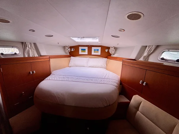Cabina de proa: equipada con una gran litera doble, escotillas superiores que aportan luz natural y ventilación, además de amplios espacios de almacenamiento en cajones y armarios roperos.
