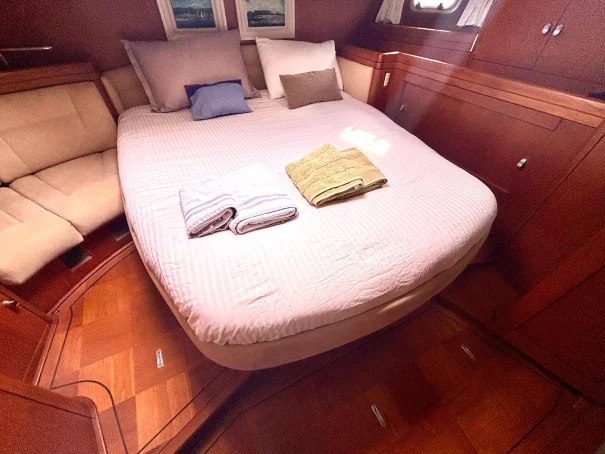 Cabina de popa: lujosa suite del armador con cama doble, baño privado con ducha y abundante espacio de almacenamiento.