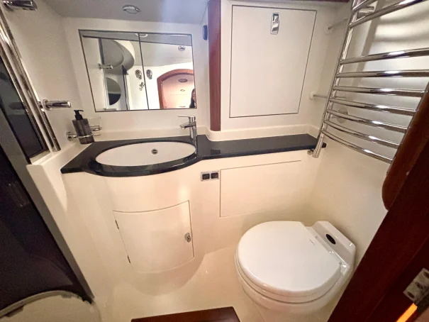 Aft Cabin: A luxurious owner’s suite with a double berth, en-suite washroom with a shower, and abundant storage.