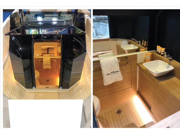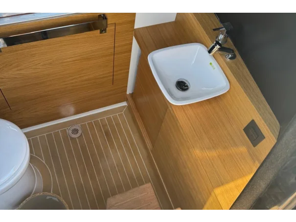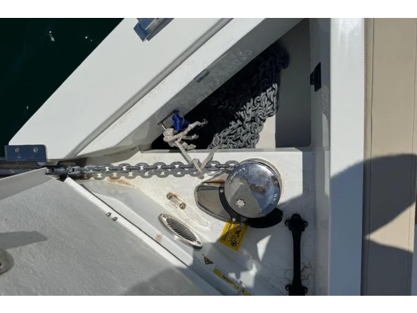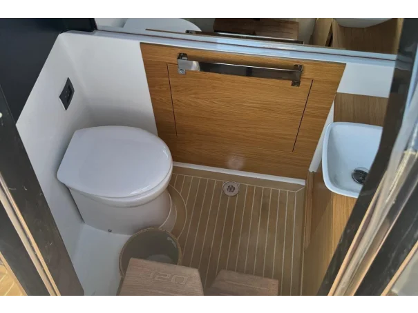En el interior, se encuentra un baño totalmente cerrado con WC eléctrico, lavabo y depósito de aguas negras de 42 L. Una zona oculta bajo cubierta ofrece espacio adicional de estiba o puede utilizarse como área de descanso.
