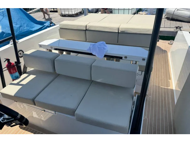 Also fitted with a bow thruster for precise port maneuvering, Zipwake® dynamic trim control system, shore power connection with battery charger, bilge pumps, and a complete electrical system with a 12V socket at the helm station.
