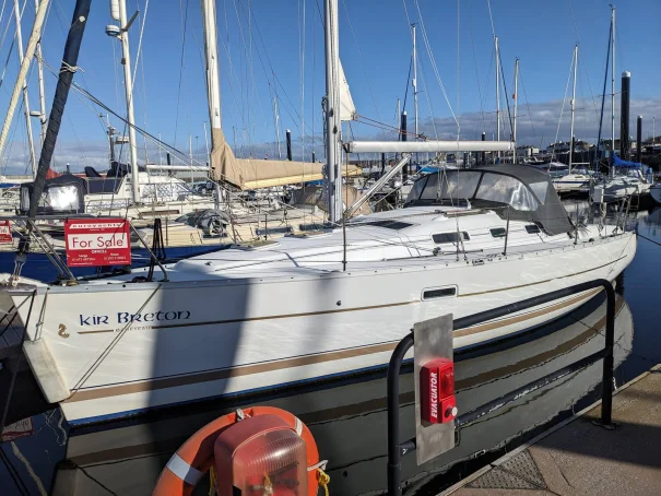 Easy access from the aft platform to the cockpit by the hinged helm seat, Steering wheel mount rotates through 90° for better space in marina or on mooring. New in-mast furling main sail in 2021, halyards renewed 2026 standing rigging renewed 2019. Hull antifouled and Volvo Penta 18hp engine serviced both April 2025.