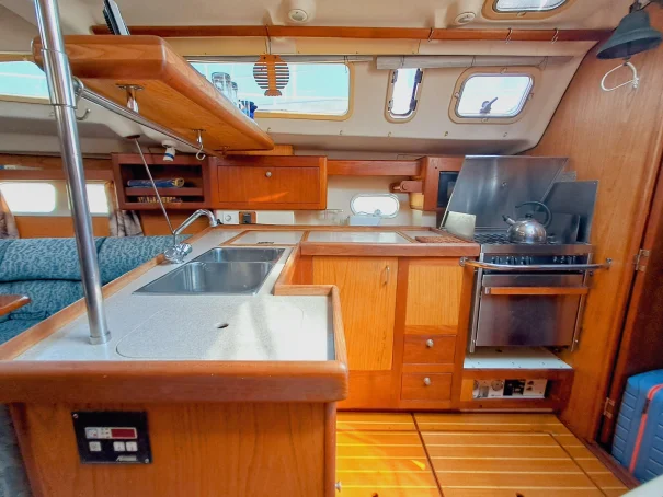 The U-shaped galley is well equipped with a three-burner hob, oven, grill, galley sink, fridge and a freezer.