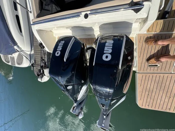 Twin Mercury 250hp V8 outboard engines giving fantastic performance, 50mph +.  Very low hours and fully serviced.  Top spec including Simrad Evo3 GPS/Plotter, Simrad VHF, Active/Auto trim tabs, Fusion sound system, bow thruster, ski pole, bimini, Flexiteak flooring, electric windlass and overall cover.  Comfortable 4 berth with galley including gas hob, microwave and 2 refrigerators etc.