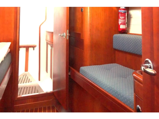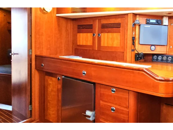 • Starboard side has a navigation station with chart table and separate chart stowage and a separate locker for glass. Underneath the table there is an 80 l refrigerator and bottle storage