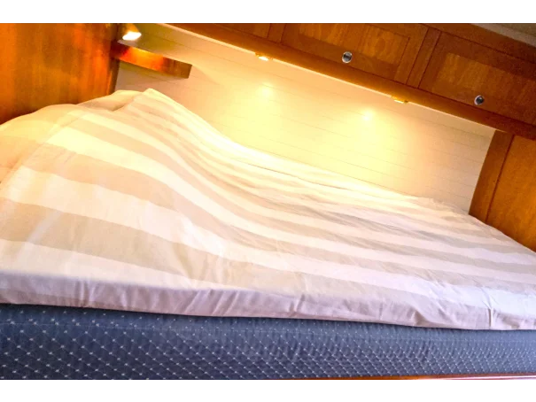 • Queen sized double berth to port with sprung mattress and thick bedding mattress