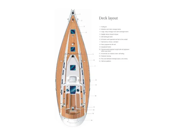 • Teak in the cockpit is laid from 12 mm first class teak ribs bonded to the deck with polyurethane. – New complete caulking done 2020