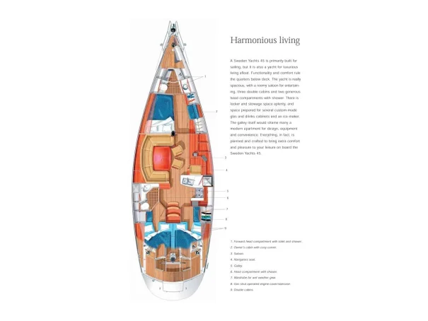 The Sweden Yachts 45 is a fast yacht, very fast. The design team, Peter Norlin and Jens Östman, set out to create the most exciting 45-footer ever built. And owners agree that they have succeeded. “Sailing a Sweden Yachts 45 makes you feel good” is a frequent comment from owners and the lucky yachtsmen who have been invited on board for a test cruise. So, it is no coincidence that the Sweden Yachts 45 was elected “Sailboat of the Year 2000” by the international yachting magazine SAIL.