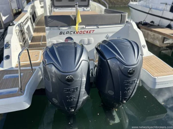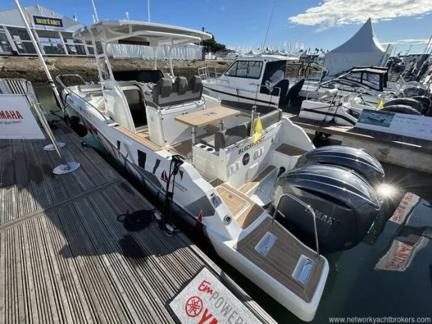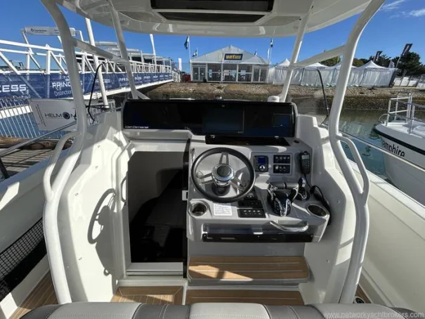 This particular example is a very highly specified example which comes equipped with bespoke Evo deck fitted throughout, Raymarine electronics, steer by wire 250hp Yamaha engines, Yamaha helm master joystick and bow thruster integration, autopilot, Zipwake trim tabs, leaning post with fridge and grill, T-top enclosure and many more.