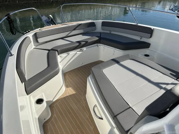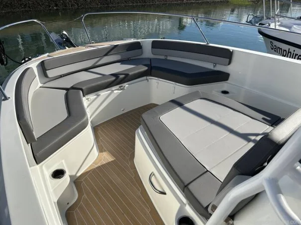 The Cap Camarat 9.0 CC’s considerable amount of on-deck seating provides fixed aft seats with backrests that are flanked by an additional pull-down bench seat on the starboard side; creating a flexible L-shaped are around the telescopic teak table that can convert into a sheltered sun pad. A very large lazarette storage locker is housed below the aft deck (a further benefit of an outboard powered boat creating more internal storage). There is another hinged storage locker situated below the aft bench seat. Further forward, behind the helm station, is a galley bench complete with sink, gas burner and fridge to help cater for lunchtime stops or evening picnics. The helm station itself has triple bolster seating. The helm’s position is in the middle at the centre of the boat, the main access to the cabin is in front of this. Being underneath the T-top and behind a generous windshield the helm and co-pilots are well protected from whatever the weather can throw at them, come rain or shine. Further forward and directly in front of the of the helm station there is centre-line double sofa. This is hinged to provide top access to the cabin below making for easy transfer of cushions or other essentials. There is more seating in the forward area complete with backrests that can be transformed into an extra-large sun pad. On the starboard side below deck there is a separate marine head with sink, shower and opening porthole. In the main cabin there is a comfortable sleeping area forward with mattress, opening hatch for ventilation. Towards the stern there is a sleeping space suitable for children.