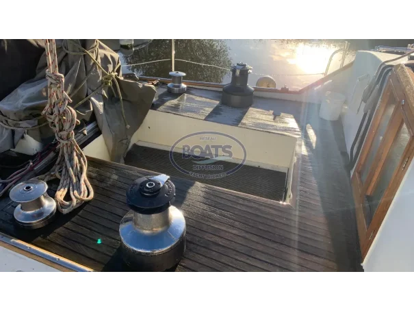 Dimensions | Longueur : 15,80 m (51â) â Largeur : 4,60 m â Tirant dâeau : 1,20 m / 3,05 m (dérive relevable) | | Construction | Coque : bois moulé acajou stratifié époxy (West System) â Pont refait en 2005â2009 (3 couches : CP marine + cèdre rouge + CP marine, stratifié fibre/époxy) | | Isolation | Intégrale : panneaux polystyrène bleu 60 mm + mousse polyuréthane (confort thermique optimal) | | Motorisation | Perkins 4.236 84 ch (entièrement refait en 2022, 300 h) â Vitesse de croisière : 6â7 nds à 1 700 tr/min | | Autonomie | 2 réservoirs gasoil (300 L) â 2 réservoirs eau douce (1 200 L) â Autonomie énergétique : 6 panneaux solaires (400 W) + éolienne 400 W | | ManÅuvrabilité | Dérive relevable (accès aux eaux peu profondes) â Propulseur dâétrave Lewmar 5,4 ch â Convoyage en solo possible | | Performances | Moyenne : 10â12 nds sur 24 h (pointes supérieures) â Régulateur dâallure ARIES + pilote automatique |
