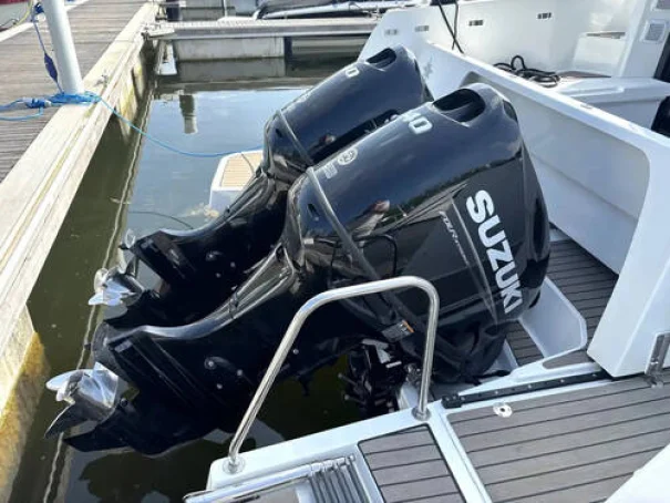 This model is equipped with twin Suzuki 140hp outboards, offering smooth, efficient performance, supported by the remaining manufacturer’s warranty and a complete service history with invoices on file — ensuring total peace of mind for her next owner.