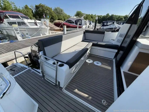The specification includes a bowthruster for effortless manoeuvring, and a spacious cockpit featuring modular seating with a luxurious L-shaped arrangement and a full sun pad to the foredeck — perfect for relaxing or entertaining guests. Inside, the light and airy saloon benefits from panoramic windows, a fully equipped galley, a stylish and practical heads compartment, a forward double berth, and a generous mid cabin, making her ideal for extended stays aboard.