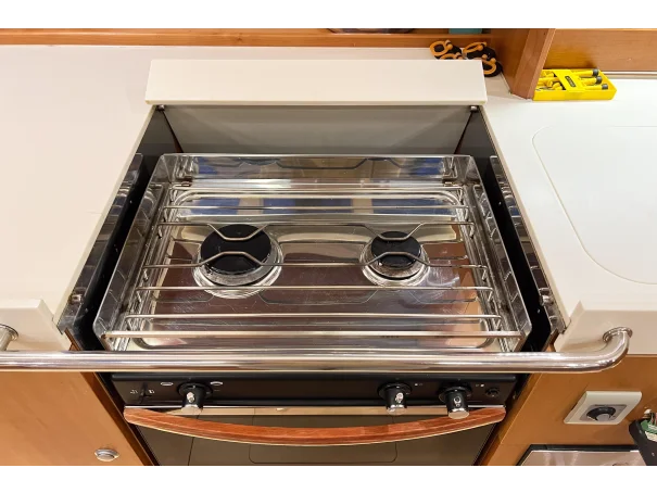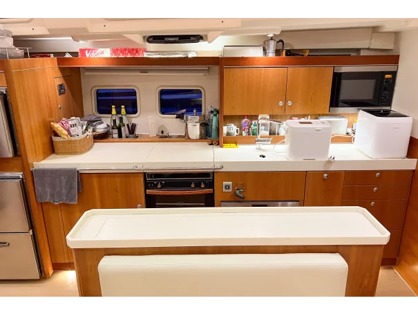 Fully equipped galley with gas cooker (two burners), oven, grill, microwave, fridge, freezer and double sink.
