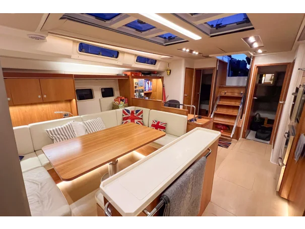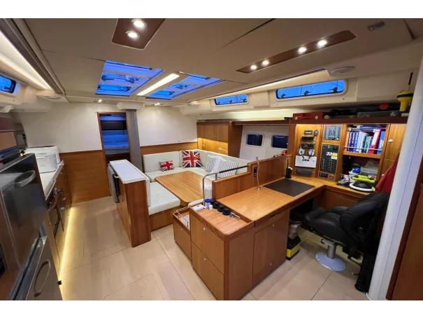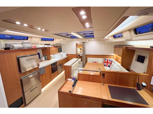 Este Hanse 575 enarbola bandera británica (SSR) y tiene el IVA pagado en Europa. El interior presenta una tapicería en piel sintética color crema y acabados en maderas claras, creando un ambiente cálido y luminoso.