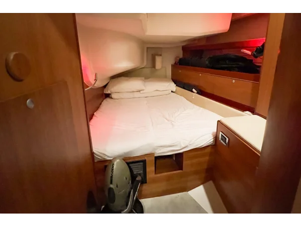 Distribución de tres camarotes, con dos camarotes en popa y una amplia suite de armador en proa. Dispone de dos baños completos, ambos con ducha y lavabo.
