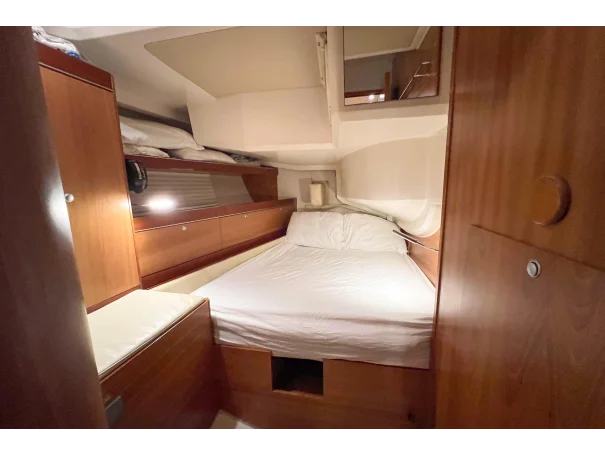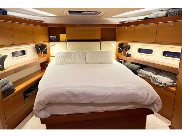El Hanse 575 ofrece un alojamiento muy confortable, con tres amplios camarotes dobles y dos baños, ideal para travesías prolongadas en familia o con amigos. Dispone además de molino de ancla eléctrico, facilitando las maniobras de fondeo y amarre.
