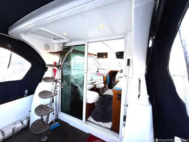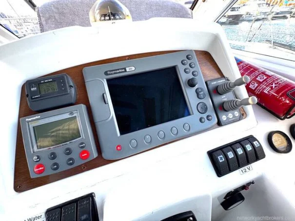 Flybridge with bimini, cushions, helm seat, instrumentation (Raymarine C60)