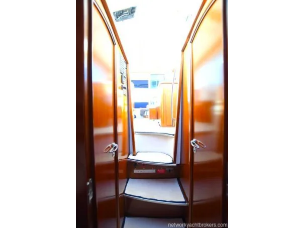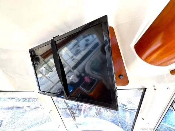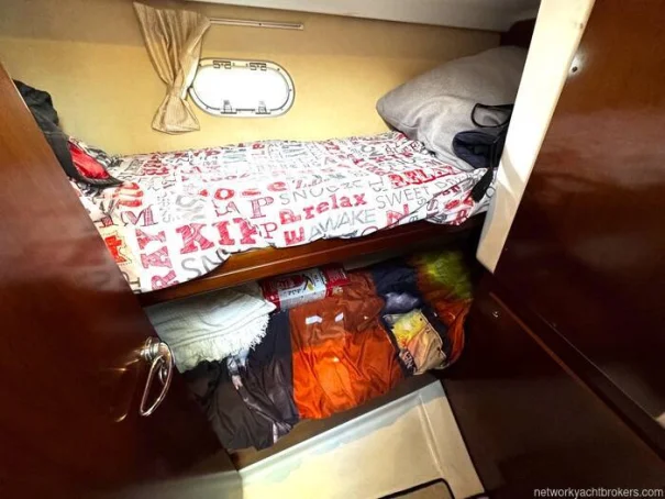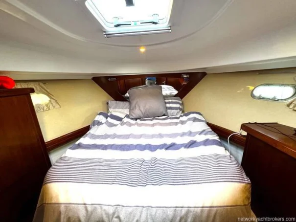 Double berth, storage, hanging locker, deck hatch, curtains, mirror, reading lights, TV/DVD