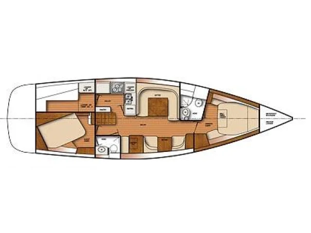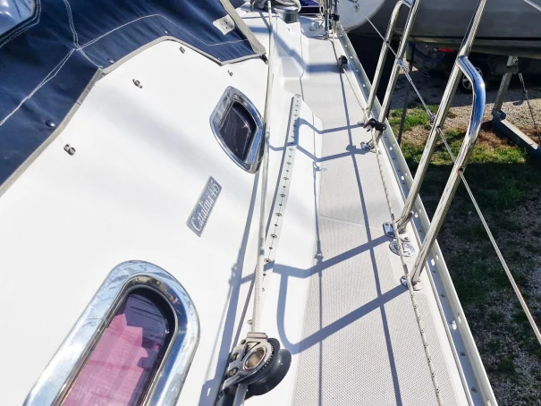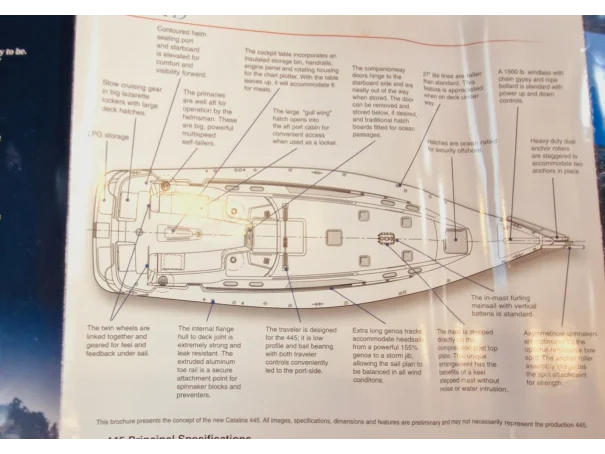 Manufacturer Provided DescriptionThe hull 445's hull form is optimized to provide the gentle, predictable motion underway, which is so appreciated in other Catalina models. The deck is strikingly handsome with a low profile cabin structure, twin helm stations and a roomy cockpit with tall, secure comfortable coamings and a cockpit table that seats 4-6. The deck is finished with a traditional diamond-patterned non-skid.