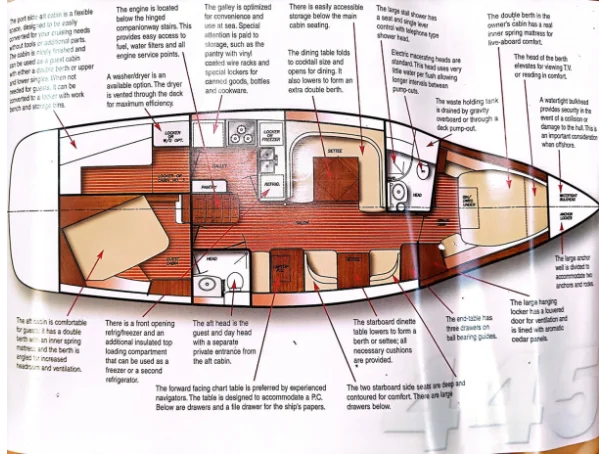 The owner's cabin is forward for privacy and optimum ventilation. Private head access from the forward cabin along with a electric head and separate shower complete the forward cabin arrangement. The guest cabin is aft with a large comfortable double berth, angled for easy access and greater headroom. This design incorporates a innovative cabin on the port side. This cabin is a flexible space that can easily be converted to whatever your cruising style dictates at the time-sleeping quarters, storage, or a work room with a bench. The galley has the storage and features needed for extended cruising.