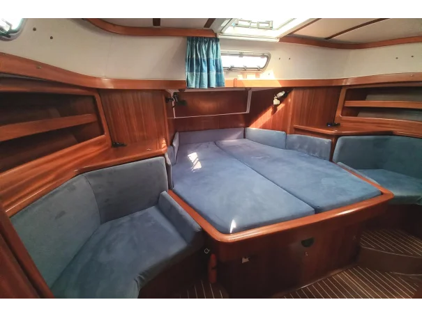 Centre cockpit layout with spacious aft double cabin and forward guest cabin, both offering good privacy. Saloon converts to additional sleeping if needed, with generous seating and a practical L-shaped galley to port.