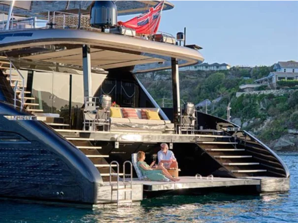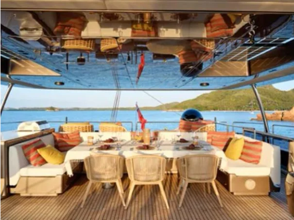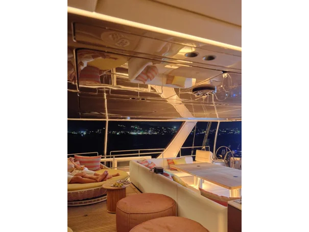The bow terrace offers a large sunken lounging area accessed directly from the main saloon. With immense living space, the yachtâs flybridge can be fitted with a spa-pool, sofas, sunpads, a dining area and a bar.