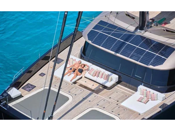 With a large panoramic glazing, the main deck saloon is an extensive and fully customizable area filled with natural light. A sliding door opens the interior lounging space wide onto the aft cockpit, inviting the outside in.