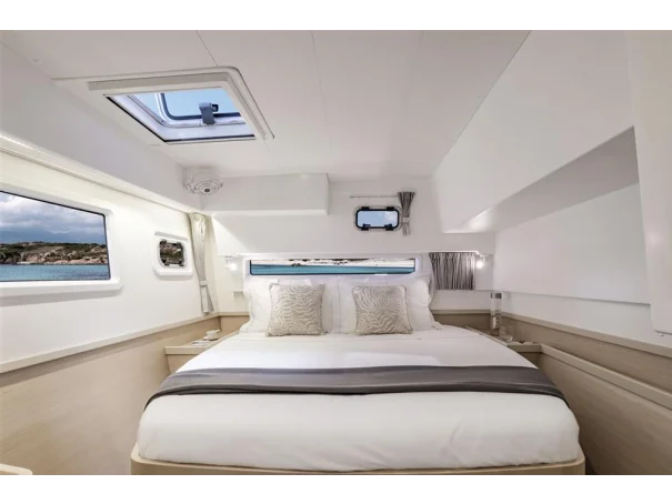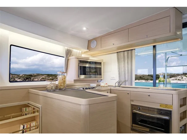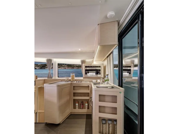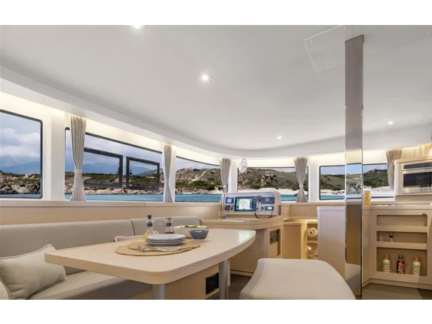 The connection between the interior and the ocean, the aft cockpit of the Millennium Lagoon 42 features multiple living areas for relaxation. Its versatility allows for a large table that can accommodate up to ten people while maintaining an easy flow of movement in the cockpit.