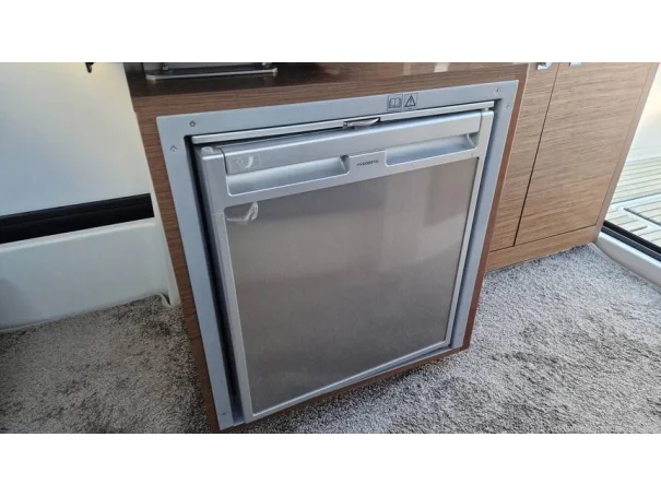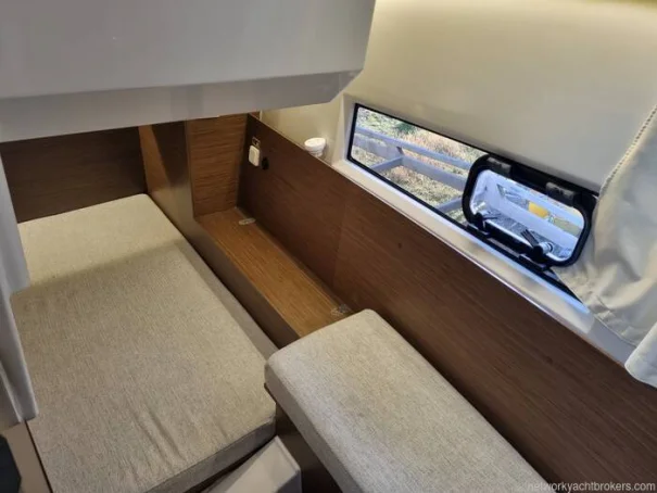 Key features of this new model include side door access from the helm station to the starboard side deck. There is a hull side access gate for safe boarding. The flush aft swim platforms are easily accessible. The sliding aft bench seat with a high back can move forward allowing for the engines to be raised. The saloon has a large opening sunroof allowing for lots of natural light. The galley offers lots of storage compartments, gas hob, sink and fridge, while the saloon table is convertible into another berth for guests. The bench seating at the saloon table can be adjusted to face forward while underway. Down below, the Merry Fisher 895 Sport has two double cabins and a separate shower and head compartment with holding tank. Curtains for wheelhouse and cabins. Luxe helm seat upgrade from standard helm seat. Sliding roof hatch and plenty of opening portlights and opening forward hatch.